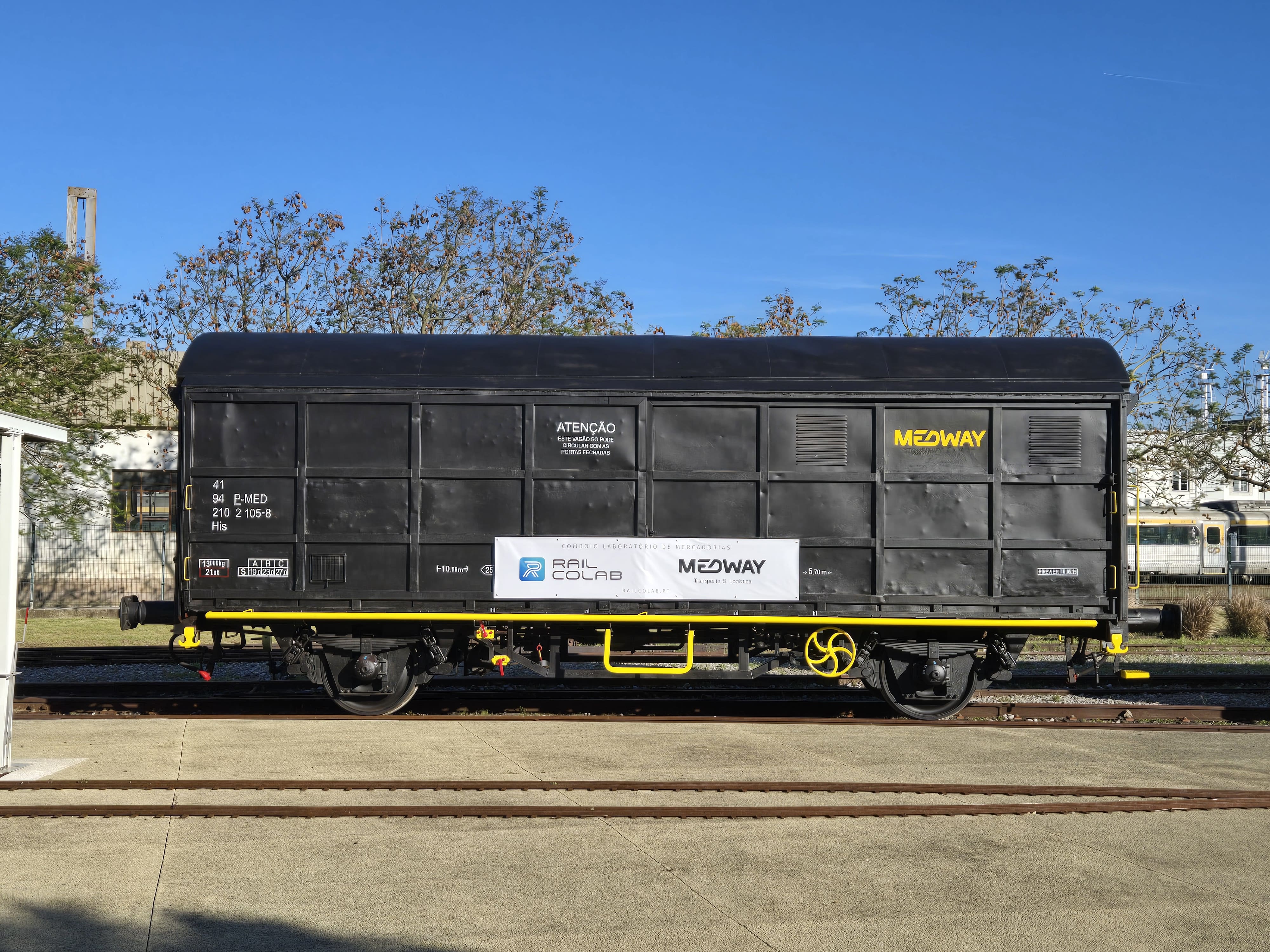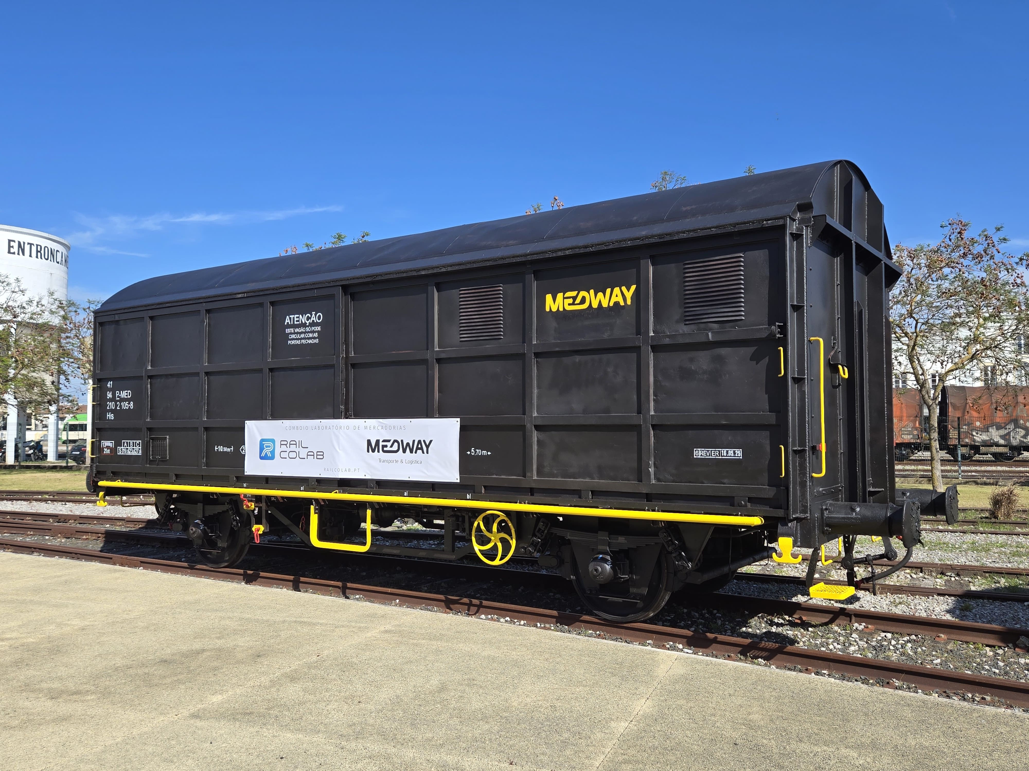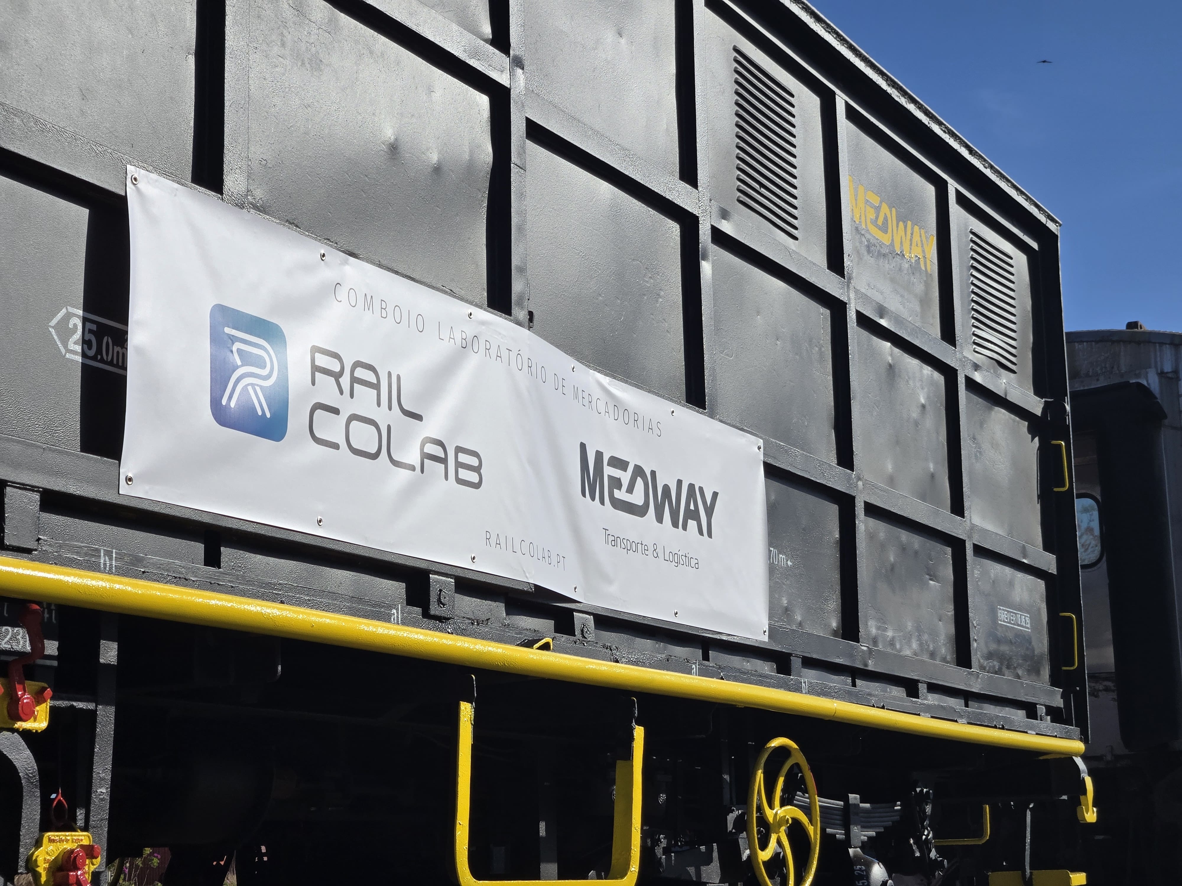 João Fernandes (RAIL CoLAB) and Carlos Vasconcelos (MEDWAY) signed an agreement to develop a Freight Laboratory Train on May 22nd, 2025, in Entroncamento. The protocol was presented in a public ceremony during this year's edition of the Portugal Railway Summit, organized by the Portuguese Railway Platform Cluster Association (PFP), which took place at the National Railway Museum. The barebones wagon, provided by MEDWAY, was already displayed at the summit. During the event, João Fernandes briefly exchanged views with the Minister of Infrastructure and Housing, Miguel Pinto Luz, reinforcing the strategic relevance of the project.